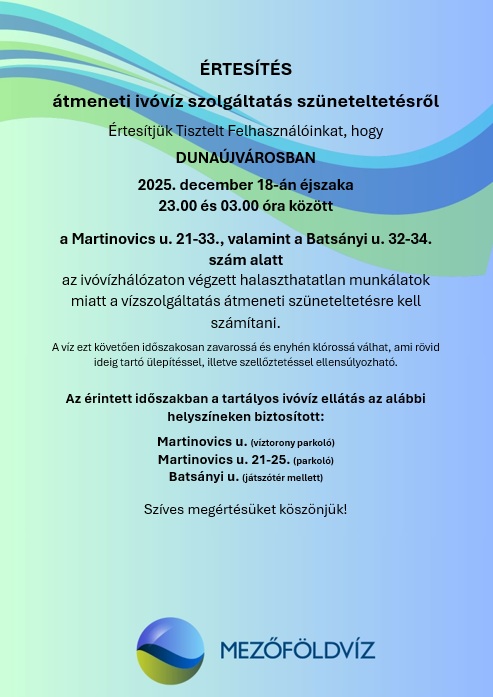 Azt írják, hogy halaszthatatlan munkálatokat kell elvégezni az ivóvízhálózaton, emiatt lesz átmeneti szünet a szolgáltatásban két éjszakát érintően. Ez idő alatt a városrész több pontján biztosítanak tartályos ivóvíz-ellátást. Felhívják arra is a figyelmet, hogy a munkálatokat követően időszakosan zavarossá és enyhén klórossá válhat a víz.