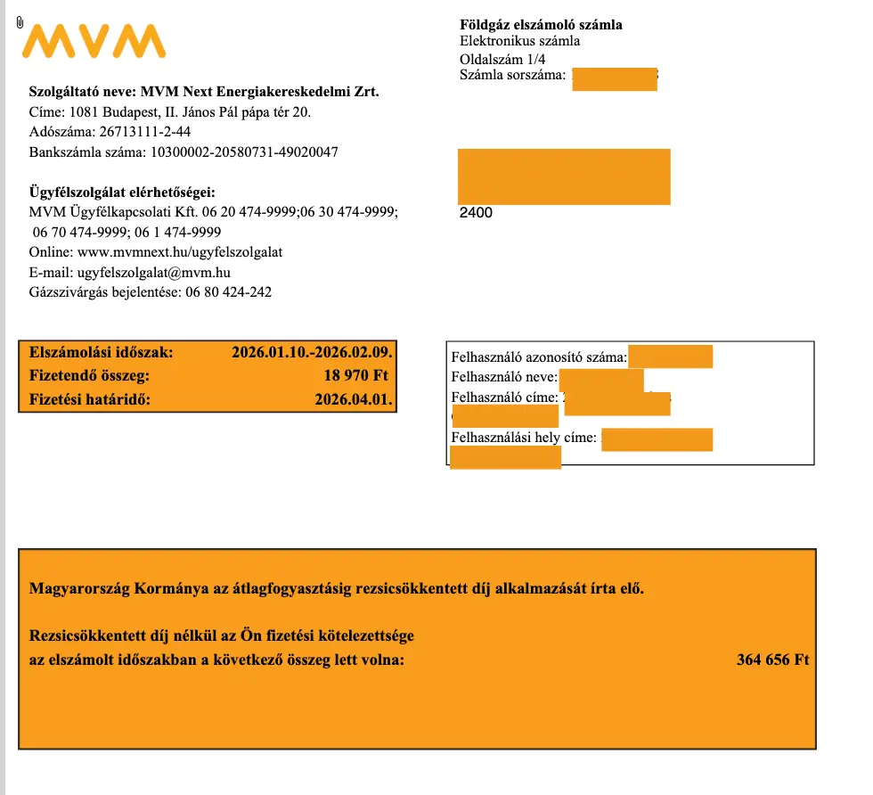 Ha nem lenne rezsicsökkentés, akkor ugyanez a fogyasztás 364 656 forintba kerülne egyetlen hónapra.