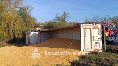 Személygépkocsi utánfutójával ütközött és árokba borult egy kukoricát szállító nyerges vontató november 9-én délután a 61-es főúton, Előszállás és Alsószentiván…